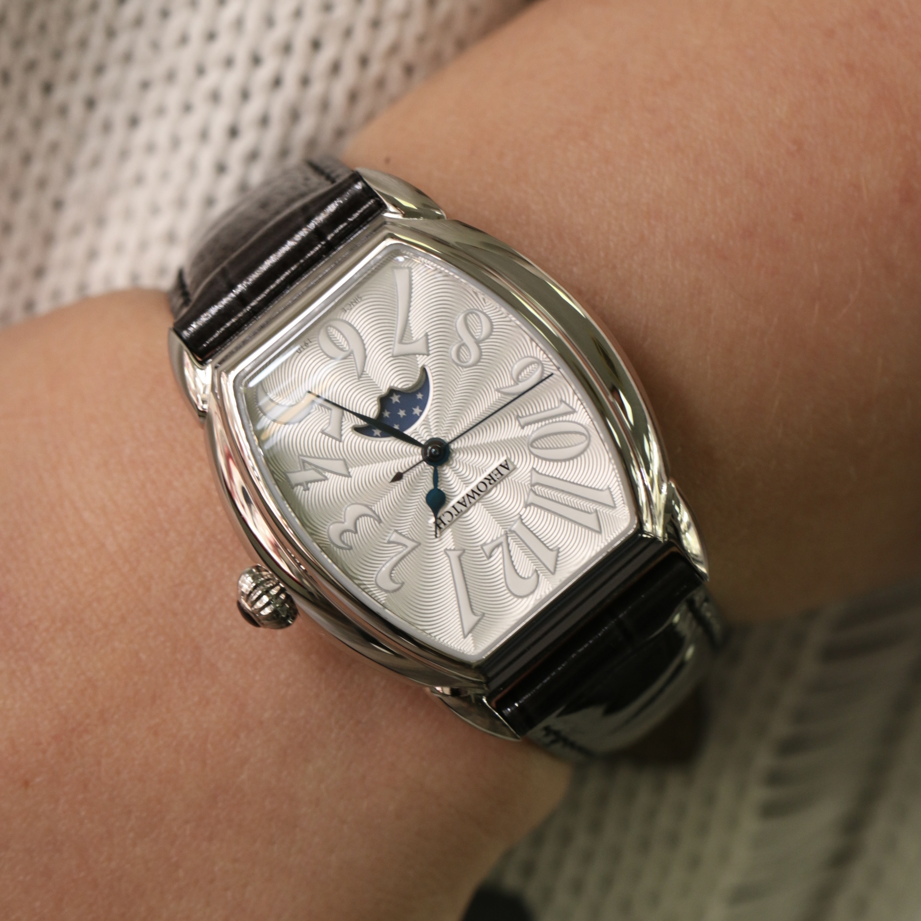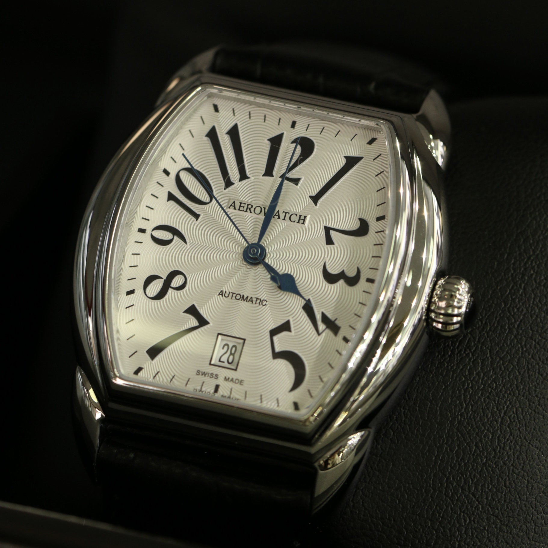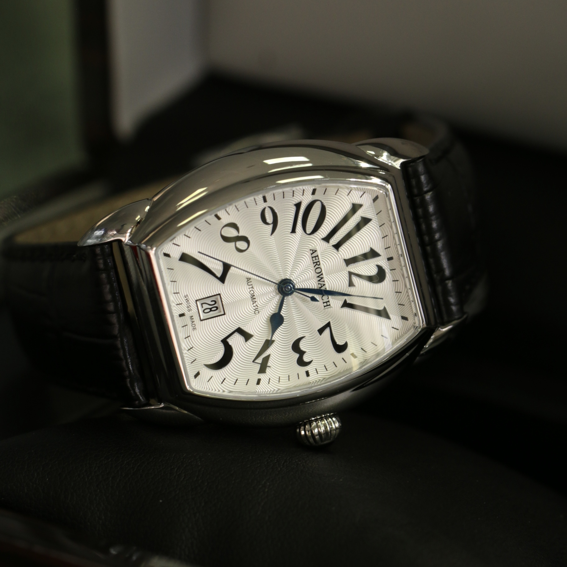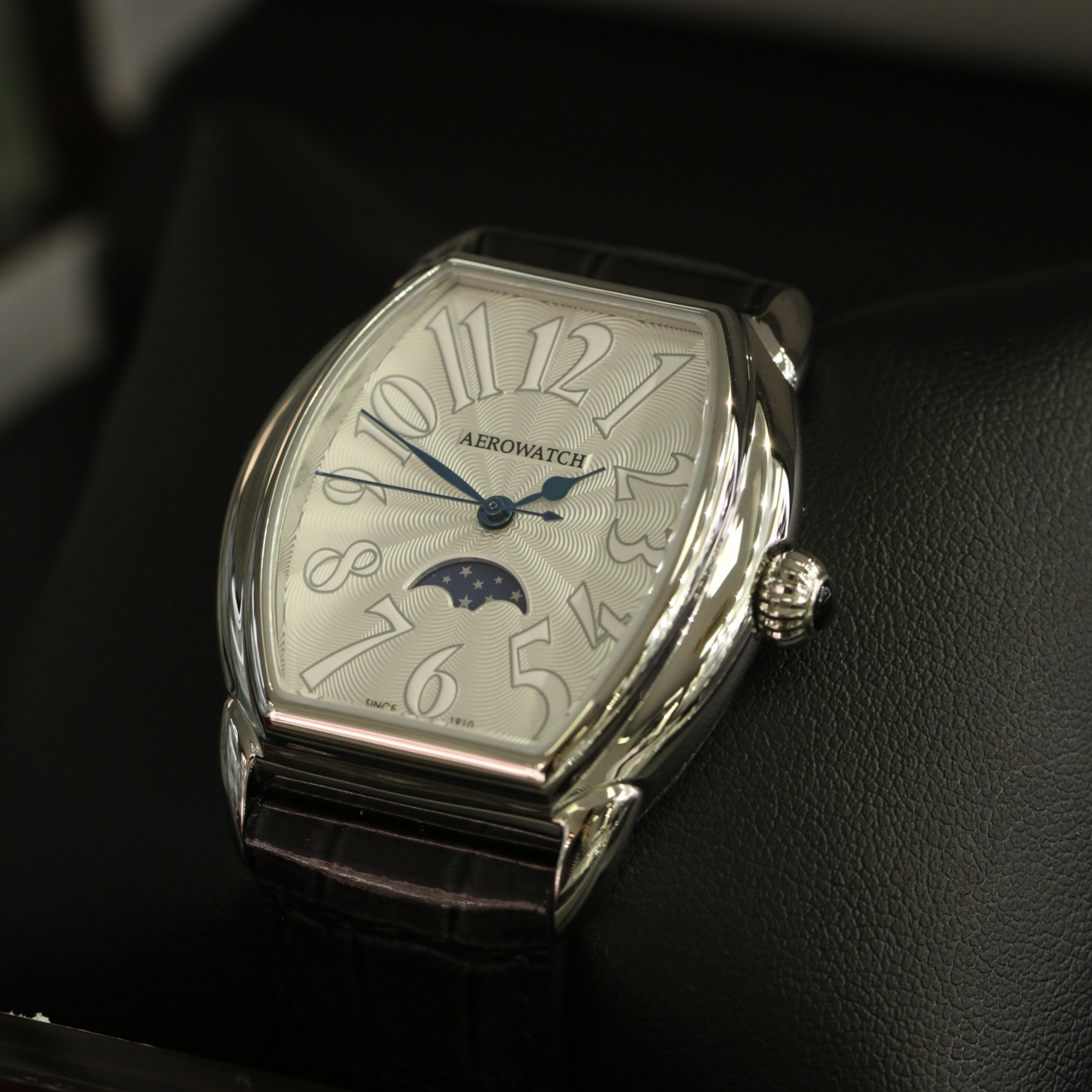 Мужская кварцевая модель 42959 RO05 из коллекции Streamline, линейки роскошных швейцарских часов Aerowatch, является символом классической утонченности. Она вызывает восхищение своим элегантным дизайном и непревзойденным мастерством исполнения. На серебристом гильошированном циферблате арабские цифры расположены так, словно подчиняются тайной гравитации. Из усложнений представлена апертура даты в положении "6 часов". При попадании солнечного света рифлёная заводная головка создает красивую игру света на изящных линиях корпуса, представленного в размере 39 x 37,5 мм. Модель комплектуется классическим коричневым ремешком с тиснением под крокодила. Водостойкость составляет 5 АТМ (50 м). Гарантия 2 года.